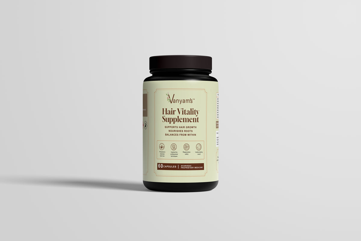 Vanyam Hair Vitality Supplement - 60 Capsules: An Ayurvedic formulation with Bhringraj, Amla and Ashwagandha to support healthy hair growth, address stress-related hair fall, and improve hair density over time.